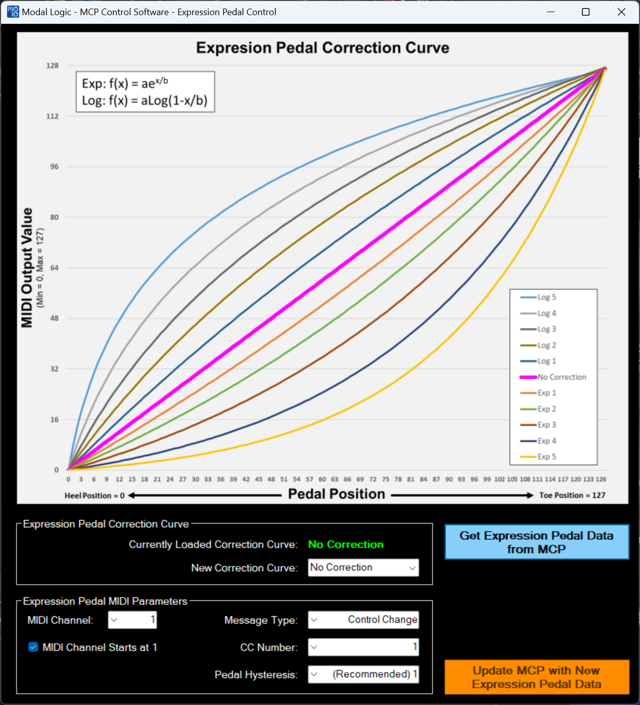 Fully configurable Expression Pedal input with tune-able correction curves to achieve highly linear response or wildly variable output based on the Expression Pedal position