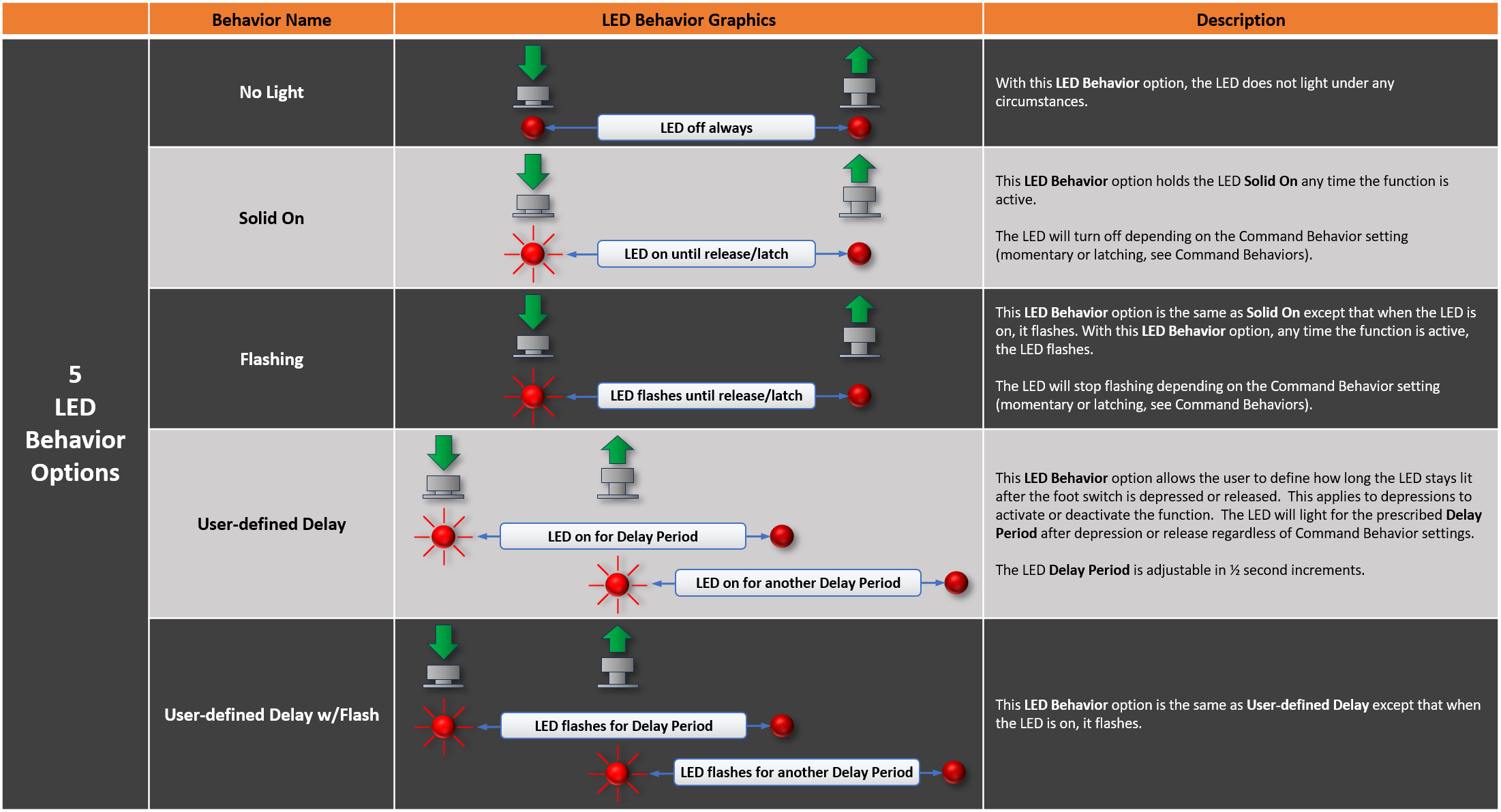 Foot Switch LEDs have 5 unique patterns/indications. This helps the musician quickly identify that the proper switch was activated